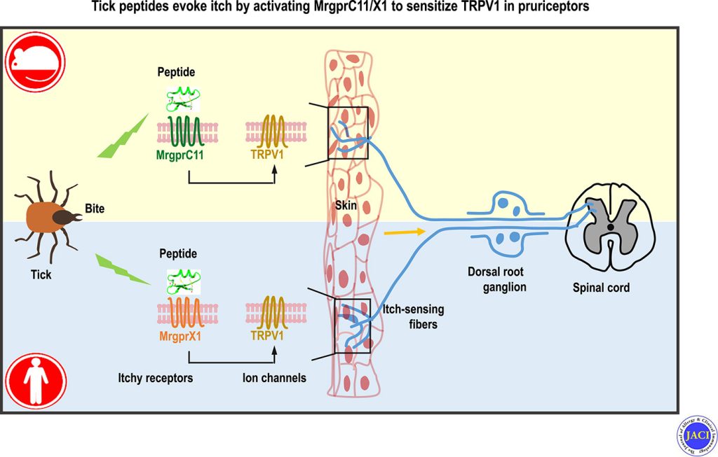 This study sought to discover potent drugs and targets for the specific prevention and treatment of tick bite–induced pruritus and arthropod-related itch.